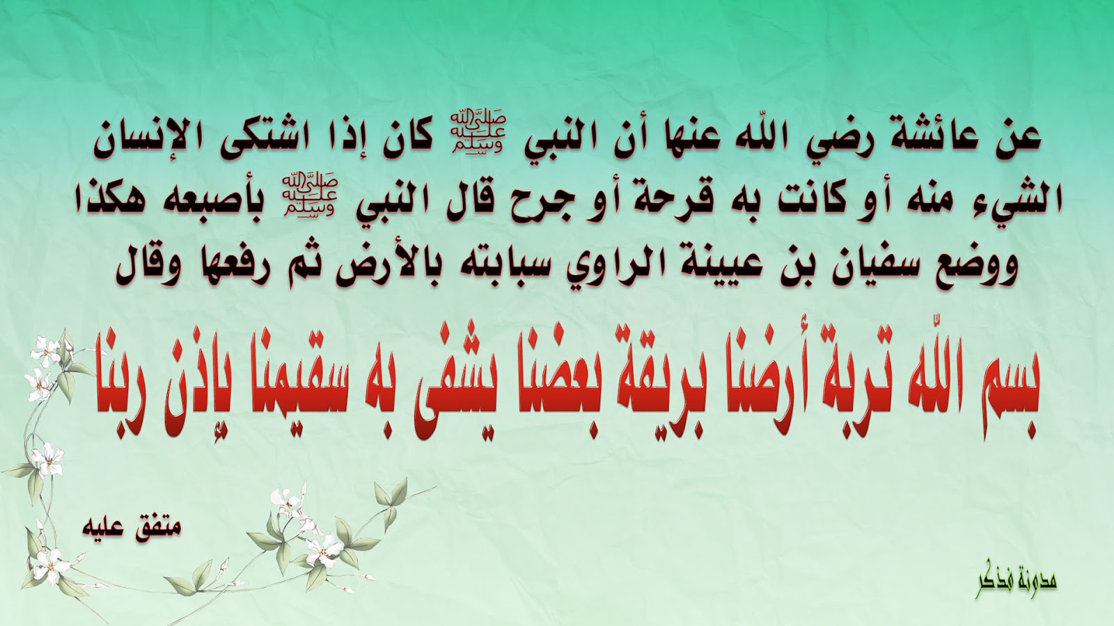 اللهم رب الناس أذهب الباس اشفه وأنت الشافي لا شفاء إلا شفاؤك شفاء لا يغادر سقما. كان النبي ص يقول في الرقية. بسم الله تربة أرضنا بريقة بعضنا ي شف ى سقيمنا بإذن ربنا رواه البخاري ومسلم. 7 رقم الصفحة.