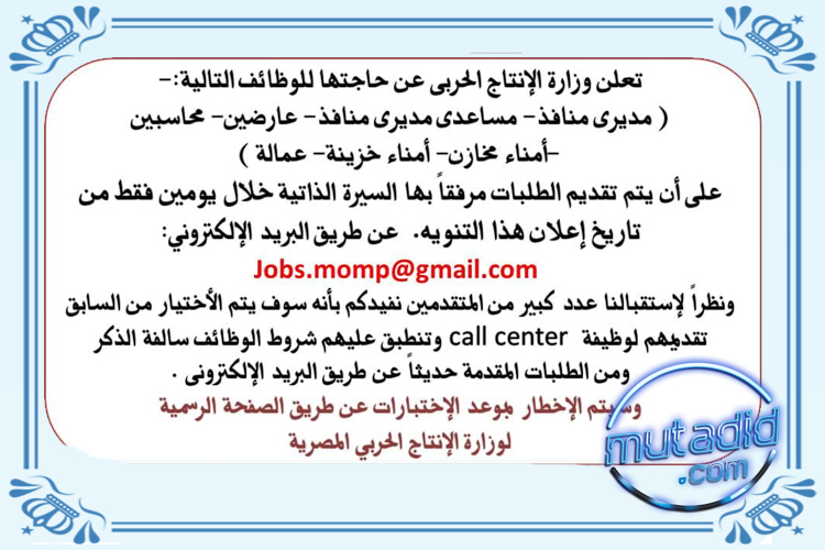 شروط التقديم في وظائف الانتاج الحربي 2019 وظائف حكومية 2019.