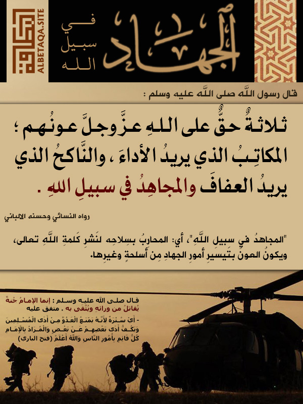ثلاثة حق على الله عونهم. المكاتب يريد الأداء والمتزوج يريد العفاف والمجاهد في سبيل الله رواه أهل السنن إلا النسائي. فالحديث حسن رواه الترمذي و البيهقي و أحمد وغيرهم ولفظه كما عند الترمذي. ث لاث ة ح ق ع ل ى الل ه ع و ن ه م. ثلاثة حق على الله عونهم.
