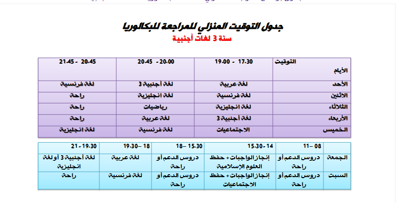 جدول برنامج المراجعة المنزلي لشهادة البكالوريا 2019 لغات اجنبية