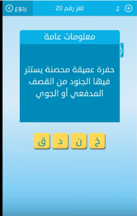 حل سؤال حفرة عميقة محصنة يستتر فيها الجنود من القصف المدفعى او الجوى من لعبة رشفة لغز رقم 20 للمجم صقور الإبدآع